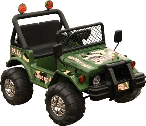 - Green Camo 12 Volt Battery Operated Ranger Rider with Horn Sounds and Working Front and Rear Lights, Drives Forward and Reverse, High and Low Speed.